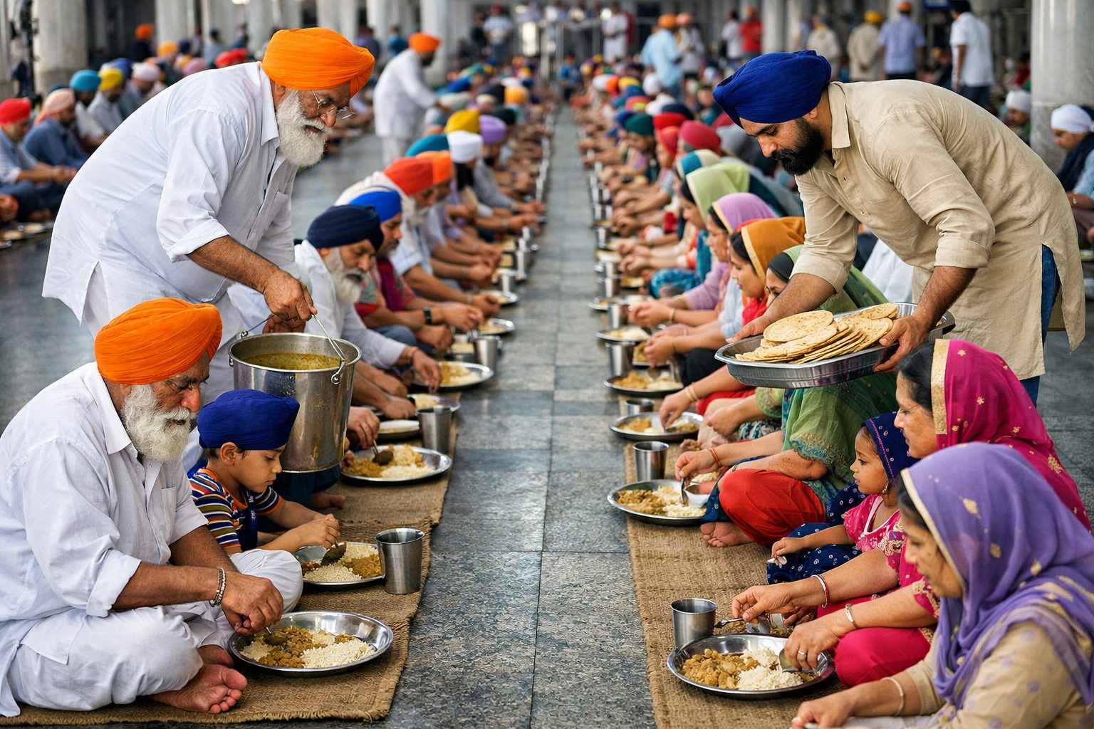 The concept of Langar is to provide everyone in need of food, irrespective of their caste, class, religion and gender, is always welcome as the Guru’s guest. Besides the virtue of sharing, the concept of Langar also teaches equality and loving-kindness. It is majorly life-sculpting for the Sikh community as even in preparing this meal, one learns many values. That is why not just serving but also preparing the Langar is as engaging and gives out a powerful message of unity and ‘Sewa’ (service). Concept of Langar started with Guru Nanak dev Ji’s ”Sacha Sauda” (a true bargain) of life is to share one’s earnings with the needy and to help the people in whatever we can.
